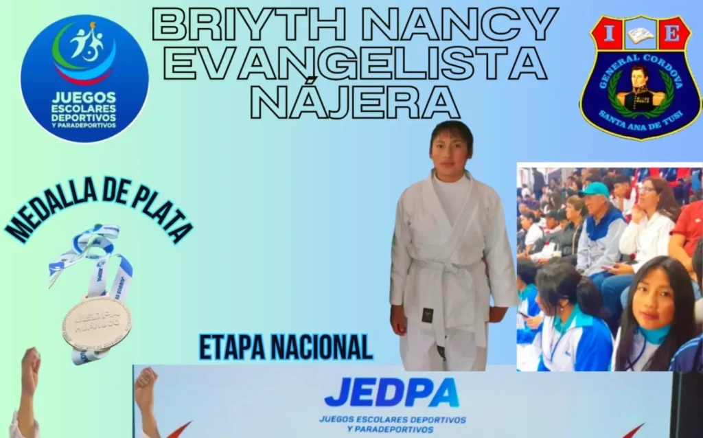Briyth Nancy Evangelista Nájera, durante la etapa nacional de los JEDPA que se desarrolló en la ciudad de Lima, logró medalla de Plata en la disciplina de Judo por la Categoría B. Ello gracias a su esfuerzo, disciplina y talento, al dejar en alto el nombre de su institución educativa y de toda nuestra Región Pasco.