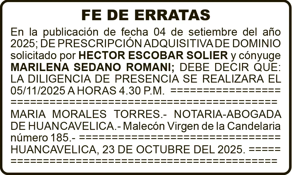 FE DE ERRATAS HUANCAVELICA FE DE ERRATAS – VIERNES 24/OCT/2025 1 min read 24 de octubre de 2025 FE DE ERRATASMARIA MORALES TORRESNOTARIA – ABOGADA DE HUANCAVELICAPRESCRIPCIÓN ADQUISITIVA DE DOMINIOContinue ReadingPrevious SUCESIÓN INTESTADA – VIERNES 24/OCT/2025Next PETITORIO MINERO HUANCAVELICA – VIERNES 24/OCT/2025