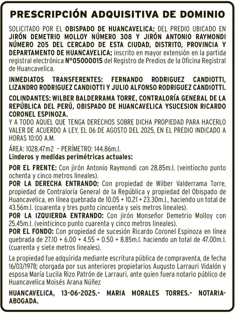 NOTIFICACIÓN DE PRETENSIÓN NOTIFICACIÓN DE PRETENSIÓN – JUEVES 26/JUN/2025 26 de junio de 2025 PRESCRIPCIÓN ADQUISITIVA DE DOMINIOSOLICITADO POR EL OBISPADO DE HUANCAVELICAPARTIDA REGISTRAL ELECTRÓNICA N° 05000015Post navigationAnterior PETITORIO MINERO PASCO – JUEVES 26/JUN/2025Próximo RECTIFICACIÓN DE PARTIDA – JUEVES 26/JUN/2025
