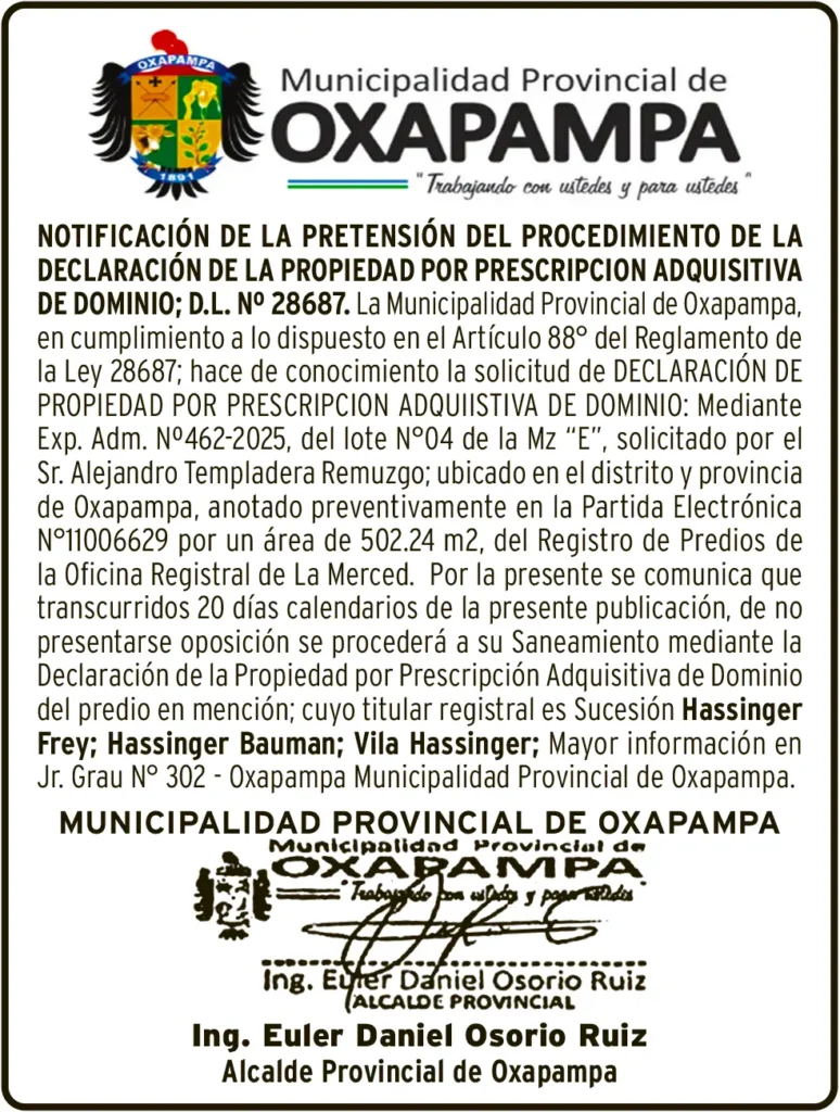 NOTIFICACIÓN DE PRETENSIÓN PASCO NOTIFICACIÓN DE PRETENSIÓN – JUEVES 29/ENE/2026 jueves, 29 de enero de 2026 | 6:08 AM NOTIFICACIÓN DE PRETENSIÓNMUNICIPALIDAD PROVINCIAL DE OXAPAMPAEXP. ADMINISTRATIVO N° 462-2025ANOTACIÓN PREVENTIVA P.E. 11006629Post navigationAnterior PETITORIO MINERO HUANCAVELICA – JUEVES 29/ENE/2026Próximo PERDIDA DE DOCUMENTOS – JUEVES 29/ENE/2026