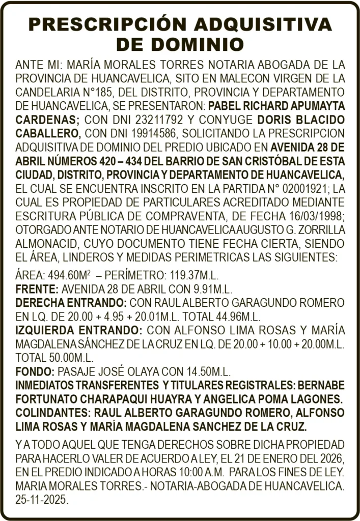 HUANCAVELICA NOTIFICACIÓN DE PRETENSIÓN NOTIFICACIÓN DE PRETENSIÓN – LUNES 15/DIC/2025 15 de diciembre de 2025 PRESCRIPCIÓN ADQUISITIVA DE DOMINIOMARIA MORALES TORRESNOTARIA – ABOGADA DE HUANCAVELICAPARTIDA N° 02001921Post navigationAnterior PLENO DEL JNE DECLARA NULAS LAS ELECCIONES PRIMARIAS DE ACCIÓN POPULARPróximo ADJUDICACIONES – LUNES 15/DIC/2025