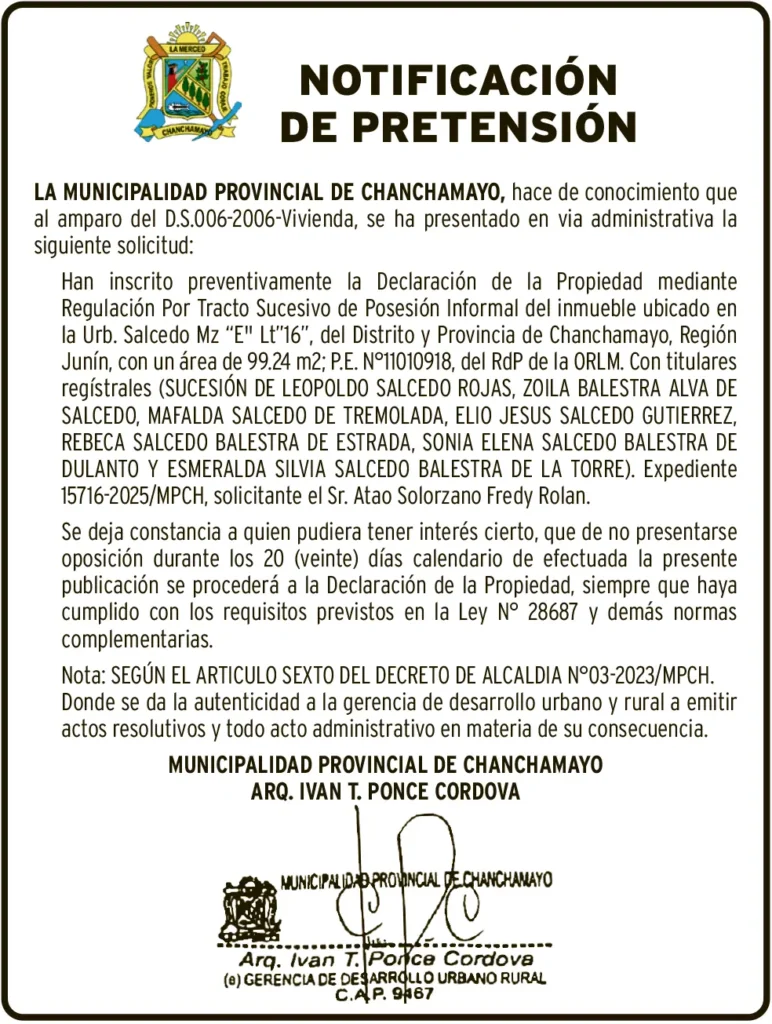 NOTIFICACIÓN DE PRETENSIÓN NOTIFICACIÓN DE PRETENSIÓN – LUNES 23/JUN/2025 23 de junio de 2025 NOTIFICACIÓN DE PRETENSIÓNMUNICIPALIDAD PROVINCIAL DE CHANCHAMAYOEXPEDIENTE N° 15716-2025/MPCHP.E. N° 11010918Post navigationAnterior ASCENSIÓN: CONDUCTOR ATROPELLA A NIÑA Y SE DA A LA FUGAPróximo PETITORIO MINERO HUANCAVELICA – LUNES 23/JUN/2025