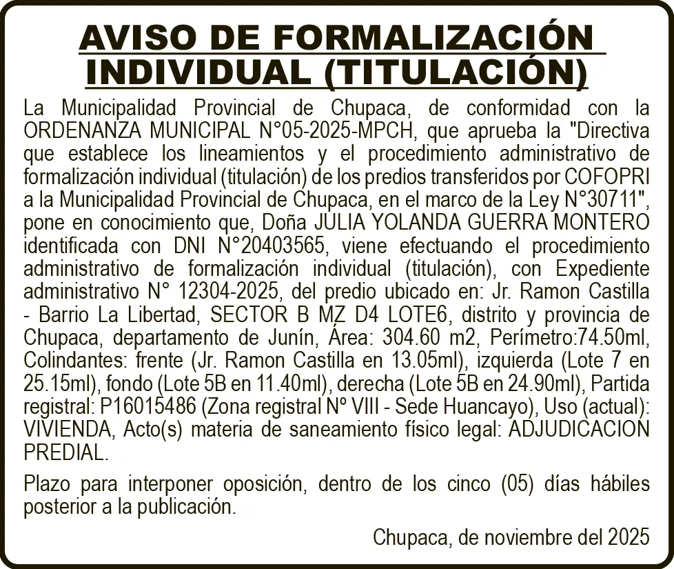 AVISO DE FORMALIZACIÓN INDIVIDUAL (TITULACIÓN)