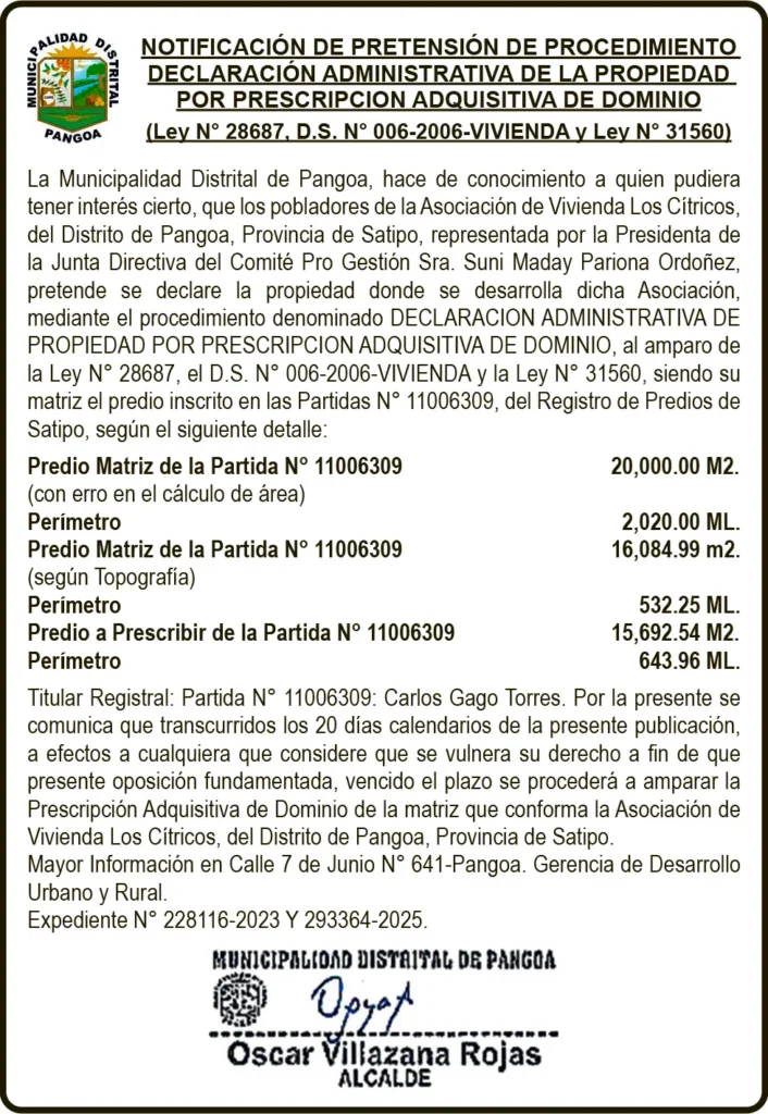 NOTIFICACIÓN DE PRETENSIÓN DE PROCEDIMIENTO DECLARACIÓN ADMINISTRATIVA DE LA PROPIEDAD POR PRESCRIPCION ADQUISITIVA DE DOMINIO