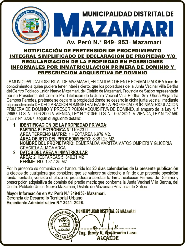 NOTIFICACIÓN DE PRETENSIÓN DE PROCEDIMIENTO INTEGRAL SIMPLIFICADO DE LA DECLARACIÓN DE PROPIEDAD Y/O REGULARIZACIÓN DE LA PROPIEDAD EN POSESIONES INFORMALES POR INMATRICULACIÓN PRIMERA DE DOMINIO Y PRESCRIPCIÓN ADQUISITVA DE DOMINIO