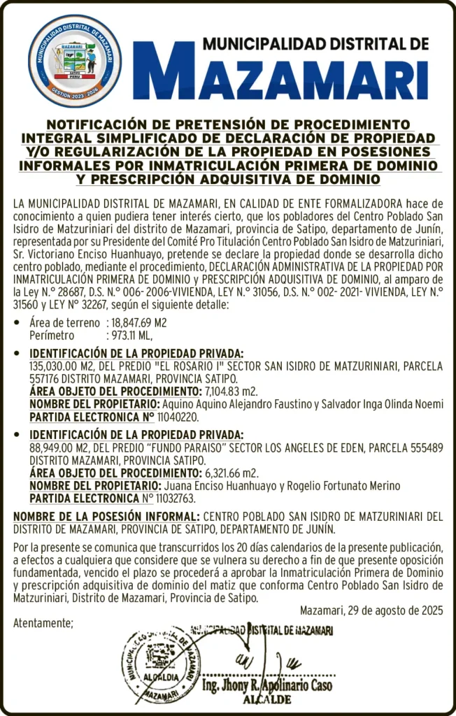 NOTIFICACIÓN DE PRETENSIÓN DE PROCEDIMIENTO INTEGRAL SIMPLIFICADO DE DECLARACIÓN DE PROPIEDAD Y/O REGULARIZACIÓN DE LA PROPIEDAD EN POSESIONES INFORMALES POR INMATRICULACIÓN PRIMERA DE DOMINIO Y PRESCRIPCIÓN ADQUISITIVA DE DOMINIO