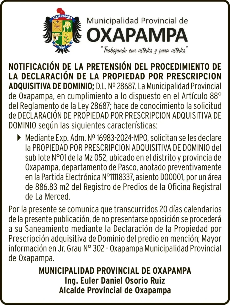 NOTIFICACIÓN DE PRETENSIÓN NOTIFICACIÓN DE PRETENSIÓN – MIÉRCOLES 04/JUN/2025 4 de junio de 2025 NOTIFICACIÓN DE PRETENSIÓNMUNICIPALIDAD PROVINCIAL DE OXAPAMPAEXP. ADM. N° 16983-2024-MPOPARTIDA ELECTRÓNICA N° 11118337Post navigationAnterior EDICTO MATRIMONIAL – MIÉRCOLES 04/JUN/2025Próximo SUMAR MOTOR CONTRA DEFENSOR 14 DE JULIO EN FINAL ADELANTADA