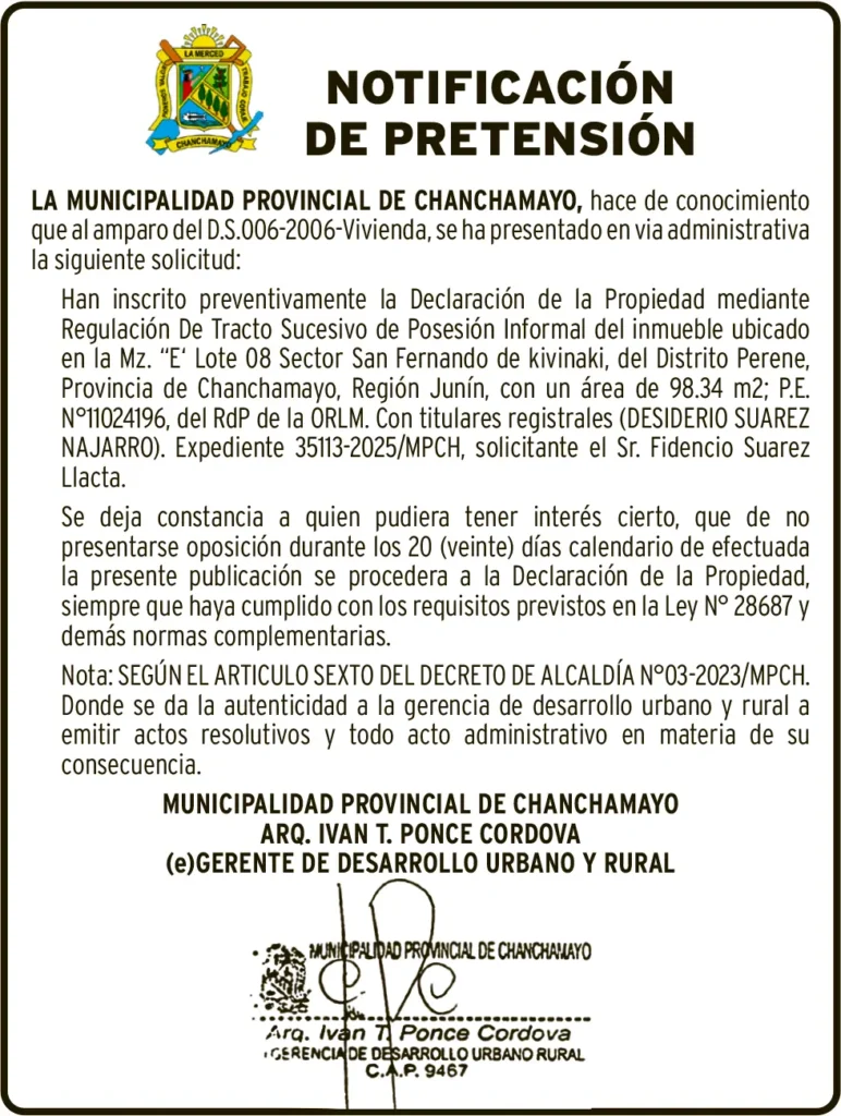JUNIN NOTIFICACIÓN DE PRETENSIÓN NOTIFICACIÓN DE PRETENSIÓN – MIÉRCOLES 26/NOV/2025 26 de noviembre de 2025 NOTIFICACIÓN DE PRETENSIÓNMUNICIPALIDAD PROVINCIAL DE CHANCHAMAYOEXPEDIENTE 35113-2025/MPCHP.E. N° 11024196Post navigationAnterior EDICTO MATRIMONIAL – MIÉRCOLES 26/NOV/2025Próximo PETITORIO MINERO PASCO – MIÉRCOLES 26/NOV/2025