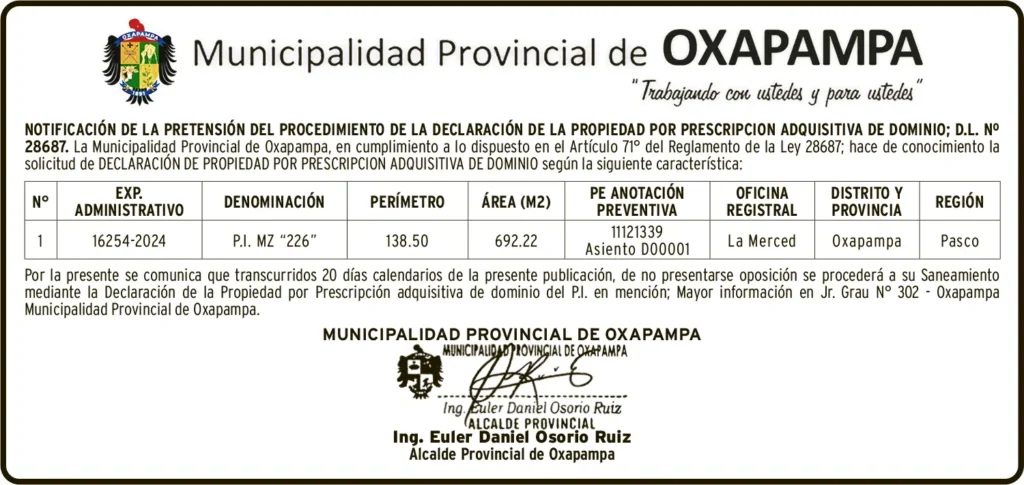 NOTIFICACIÓN DE PRETENSIÓN PASCO NOTIFICACIÓN DE PRETENSIÓN – MIÉRCOLES 29/OCT/2025 1 min read 29 de octubre de 2025 NOTIFICACIÓN DE PRETENSIÓNMUNICIPALIDAD PROVINCIAL DE OXAPAMPAEXP. ADMINISTRATIVO N° 16254-2024ANOTACIÓN PREVENTIVA P.E. 11121339Continue ReadingPrevious PETITORIO MINERO HUANCAVELICA – MIÉRCOLES 29/OCT/2025Next SANEAMIENTO FÍSICO LEGAL – MIÉRCOLES 29/OCT/2025