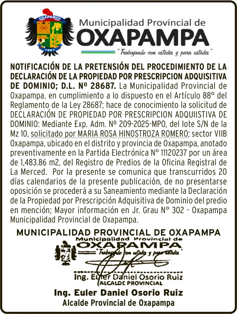 NOTIFICACIÓN DE PRETENSIÓN PASCO NOTIFICACIÓN DE PRETENSIÓN – SÁBADO 06/NOV/2025 sábado, 6 de diciembre de 2025 | 1:04 AM NOTIFICACIÓN DE PRETENSIÓNMUNICIPALIDAD PROVINCIAL DE OXAPAMPAEXP. ADMINISTRATIVO N° 209-2025-MPOANOTACIÓN PREVENTIVA P.E. 11120237Post navigationAnterior HUAYTARÁ: INCENDIO DEJA A FAMILIA EN LA INTEMPERIE EN OCOROPróximo SANEAMIENTO FÍSICO LEGAL – SÁBADO 06/DIC/2025