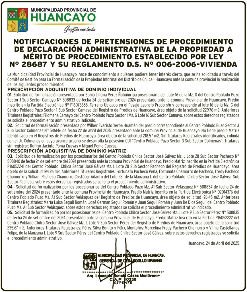NOTIFICACIÓN DE PRETENSIÓN NOTIFICACIÓN DE PRETENSIÓN – SÁBADO 31/MAY/2025 sábado, 31 de mayo de 2025 | 1:33 AM NOTIFICACIÓN DE PRETENSIÓNMUNICIPALIDAD PROVINCIAL DE HUANCAYOPARTIDA ELECTRONICA N° P16073658PARTIDA ELECTRONICA N° P16052241PARTIDA ELECTRONICA N° 02014376PARTIDA ELECTRONICA N° P16052222Post navigationAnterior RECTIFICACIÓN DE PARTIDA – SÁBADO 31/MAY/2025Próximo ARRANCA CUADRANGULAR DE LA COPA PERÚ MAÑANA DOMINGO
