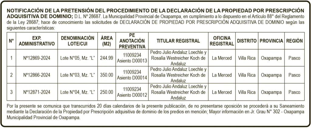 NOTIFICACIÓN DE PRETENSIÓN NOTIFICACIÓN DE PRETENSIÓN – VIERNES 02/MAY/2025 2 de mayo de 2025 NOTIFICACIÓN DE PRETENSIÓNMUNICIPALIDAD PROVINCIAL DE OXAPAMPAEXP. ADMINISTRATIVO N°12869-2024EXP. ADMINISTRATIVO N°12866-2024EXP. ADMINISTRATIVO N°12871-2024Post navigationAnterior PETITORIO MINERO HUANCAVELICA – VIERNES 02/MAY/2025Próximo HOY FERIADO: RENIEC CONTINÚA ENTREGANDO DNI