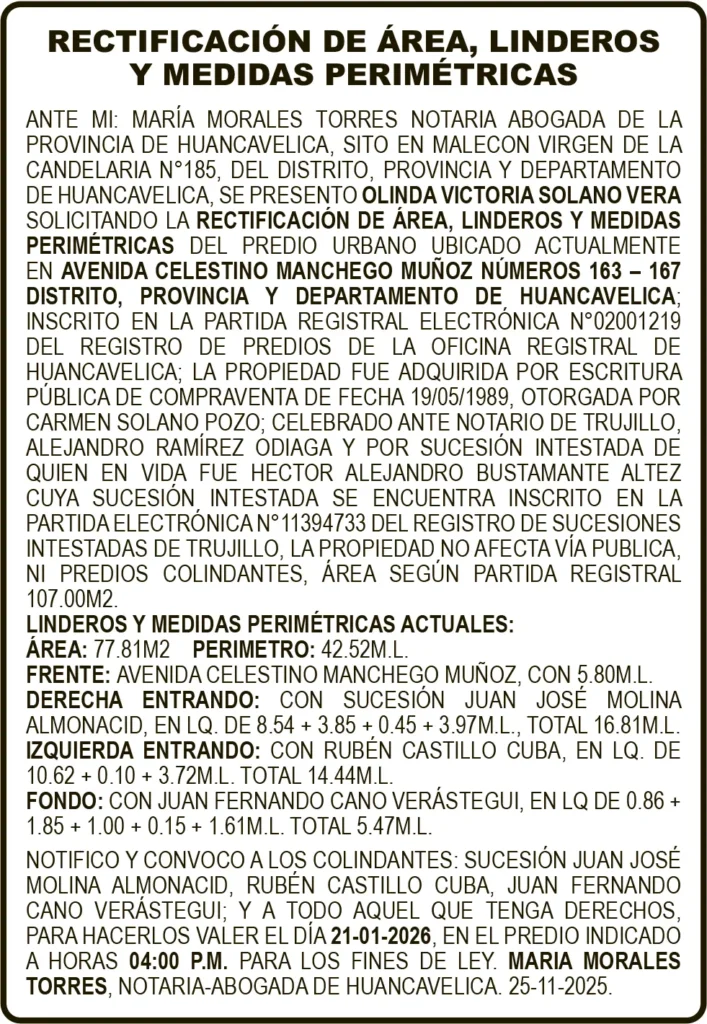 HUANCAVELICA NOTIFICACIÓN DE PRETENSIÓN NOTIFICACIÓN DE PRETENSIÓN – VIERNES 05/DIC/2025 viernes, 5 de diciembre de 2025 | 1:43 AM RECTIFICACIÓN DE ÁREA, LINDEROS Y MEDIDAS PERIMÉTRICASMARIA MORALES TORRESNOTARIA – ABOGADA DE HUANCAVELICAPARTIDA REGISTRAL ELECTRÓNICA N° 02001219Post navigationAnterior PETITORIO MINERO PASCO – VIERNES 05/DIC/2025Próximo CONVOCATORIAS – VIERNES 05/DIC/2025