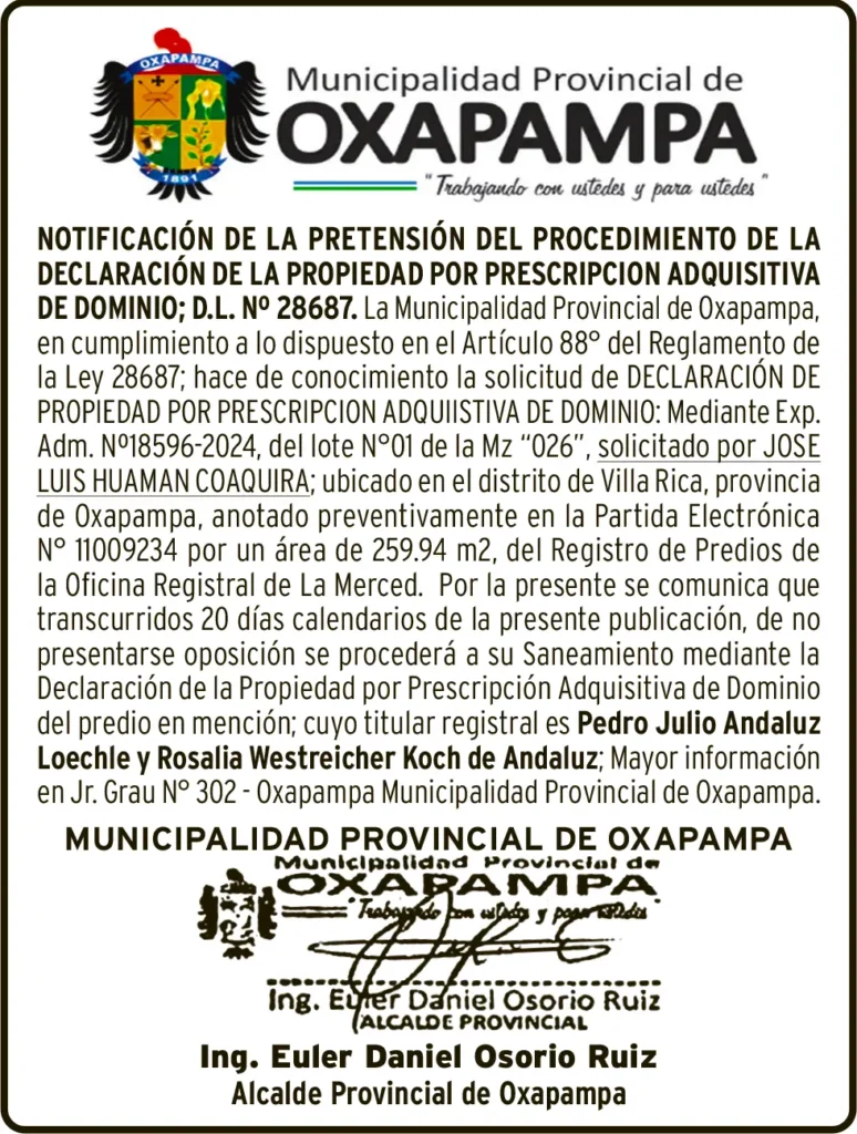NOTIFICACIÓN DE PRETENSIÓN PASCO NOTIFICACIÓN DE PRETENSIÓN – VIERNES 14/NOV/2025 1 min read 14 de noviembre de 2025 NOTIFICACIÓN DE PRETENSIÓNMUNICIPALIDAD PROVINCIAL DE OXAPAMPAEXP. ADMINISTRATIVO N° 18596-2024ANOTACIÓN PREVENTIVA P.E. 11009234Continue ReadingPrevious NOTIFICACIÓN POR EDICTO – VIERNES 14/NOV/2025Next EDICTO JUDICIAL HUANCAVELICA – VIERNES 14/NOV/2025