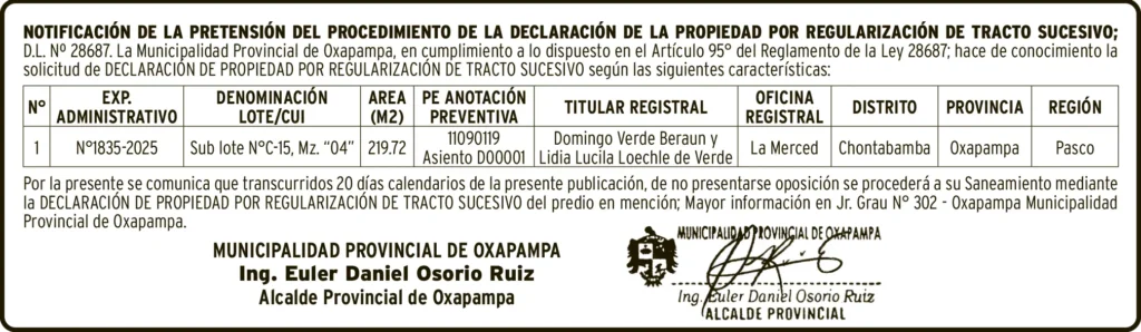 NOTIFICACIÓN DE LA PRETENSIÓN DEL PROCEDIMIENTO DE LA DECLARACIÓN DE LA PROPIEDAD POR REGULARIZACIÓN DE TRACTO SUCESIVO