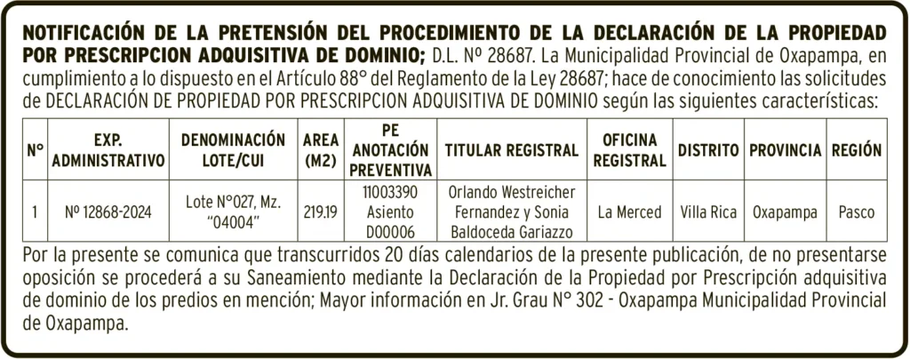 NOTIFICACIÓN DE PRETENSIÓN NOTIFICACIÓN DE PRETENSIÓN – VIERNES 20/JUN/2025 20 de junio de 2025 NOTIFICACIÓN DE PRETENSIÓNMUNICIPALIDAD PROVINCIAL DE OXAPAMPAEXP. ADMINISTRATIVO N° 12868-2024P.E. ANOTACIÓN PREVENTIVA 11003390Post navigationAnterior PETITORIO MINERO HUANCAVELICA – VIERNES 20/JUN/2025Próximo PETITORIO MINERO PASCO – VIERNES 20/JUN/2025