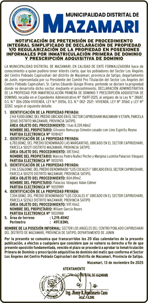 NOTIFICACIÓN DE PRETENSIÓN DE PROCEDIMIENTO INTEGRAL SIMPLIFICADO DE DECLARACIÓN DE PROPIEDAD Y/O REGULARIZACIÓN DE LA PROPIEDAD EN POSESIONES INFORMALES POR INMATRICULACIÓN PRIMERA DE DOMINIO Y PRESCRIPCIÓN ADQUISITIVA DE DOMINIO