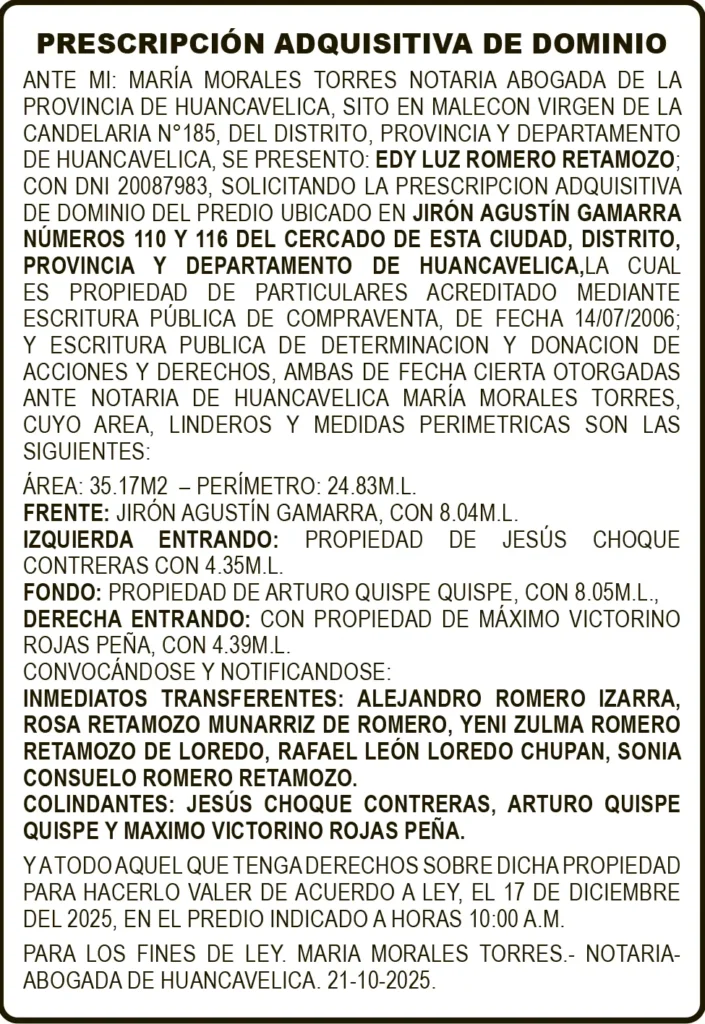 HUANCAVELICA NOTIFICACIÓN DE PRETENSIÓN NOTIFICACIÓN DE PRETENSIÓN – VIERNES 24/OCT/2025 1 min read 24 de octubre de 2025 PRESCRIPCIÓN ADQUISITIVA DE DOMINIOMARIA MORALES TORRESNOTARIA – ABOGADA DE HUANCAVELICAContinue ReadingPrevious EDICTO JUDICIAL HUANCAVELICA – VIERNES 24/OCT/2025Next SANEAMIENTO FÍSICO LEGAL – VIERNES 24/OCT/2025