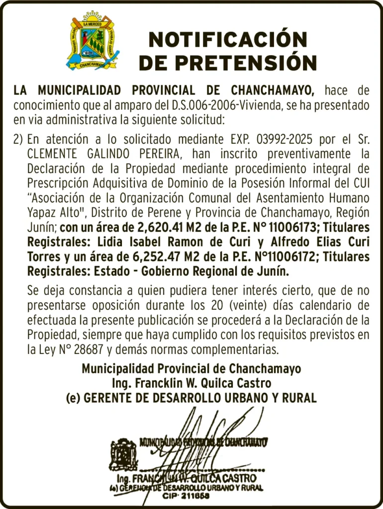 JUNIN NOTIFICACIÓN DE PRETENSIÓN NOTIFICACIÓN DE PRETENSIÓN – VIERNES 31/OCT/2025 1 min read 31 de octubre de 2025 NOTIFICACIÓN DE PRETENSIÓNMUNICIPALIDAD PROVINCIAL DE CHANCHAMAYOEXPEDIENTE 03992-2025P.E. N° 11006173 / 11006172Continue ReadingPrevious RECTIFICACIÓN DE PARTIDA – VIERNES 31/OCT/2025Next PETITORIO MINERO PASCO – VIERNES 31/OCT/2025