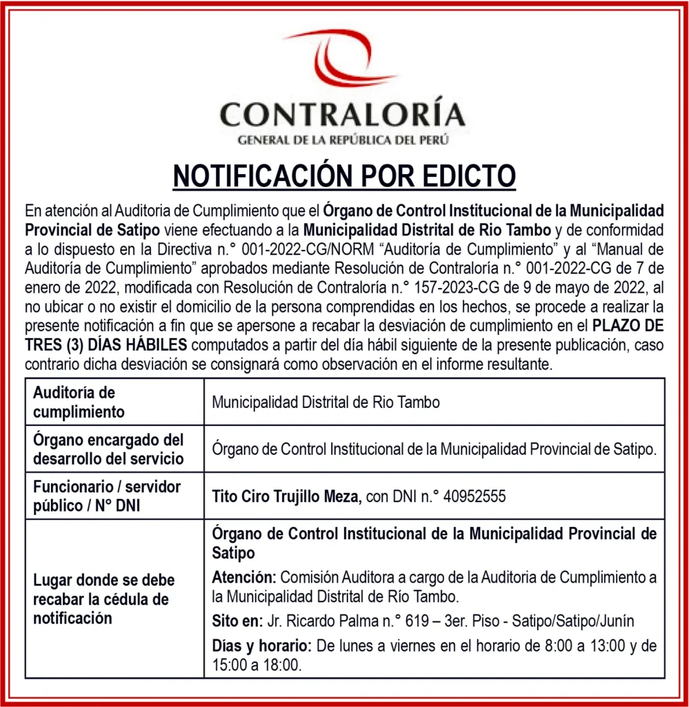 JUNIN NOTIFICACIÓN POR EDICTO NOTIFICACIÓN POR EDICTO – MIÉRCOLES 19/NOV/2025 19 de noviembre de 2025 CONTRALORÍA GENERAL DE LA REPÚBLICA DEL PERÚNOTIFICACIÓN POR EDICTOAUDITORIA DE CUMPLIMIENTOMUNICIPALIDAD DISTRITAL DE RIO TAMBOPost navigationAnterior RECTIFICACIÓN DE PARTIDA – MIÉRCOLES 19/NOV/2025Próximo JUNÍN LOGRA 38 MEDALLAS EN JUEGOS ESCOLARES DEPORTIVOS Y PARADEPORTIVOS (JEDPA) 2025