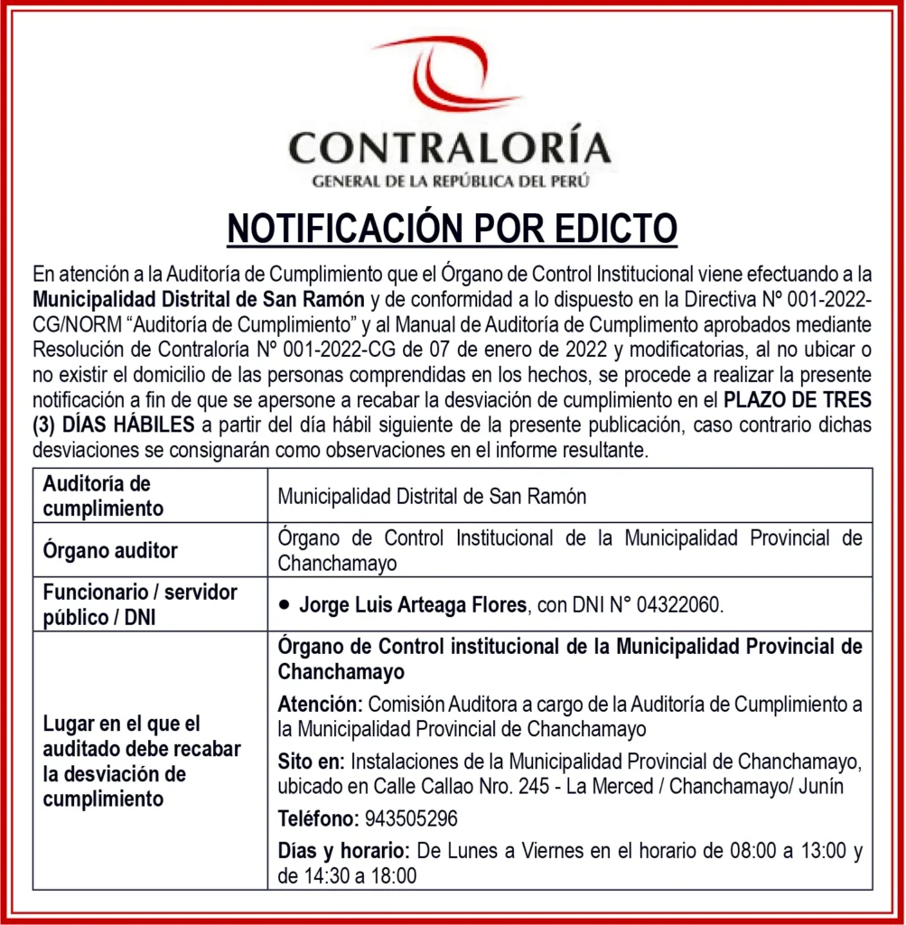 JUNIN NOTIFICACIÓN POR EDICTO NOTIFICACIÓN POR EDICTO – VIERNES 21/NOV/2025 21 de noviembre de 2025 CONTRALORÍA GENERAL DE LA REPÚBLICA DEL PERÚNOTIFICACIÓN POR EDICTOAUDITORIA DE CUMPLIMIENTOMUNICIPALIDAD DISTRITAL DE SAN RAMONPost navigationAnterior NOTIFICACIÓN DE PRETENSIÓN – VIERNES 21/NOV/2025Próximo PETITORIO MINERO PASCO – VIERNES 21/NOV/2025