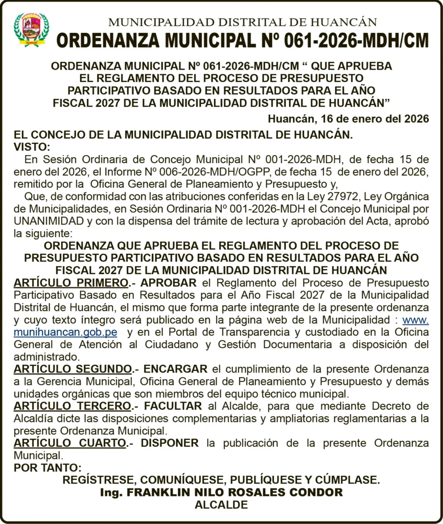 JUNIN ORDENANZA MUNICIPAL ORDENANZA MUNICIPAL – JUEVES 22/ENE/2026 jueves, 22 de enero de 2026 | 6:39 AM MUNICIPALIDAD DISTRITAL DE HUANCÁNORDENANZA MUNICIPAL N° 061-2025-MDH/CMPost navigationAnterior SANEAMIENTO FÍSICO LEGAL – JUEVES 22/ENE/2026Próximo PETITORIO MINERO HUANCAVELICA – JUEVES 22/ENE/2026