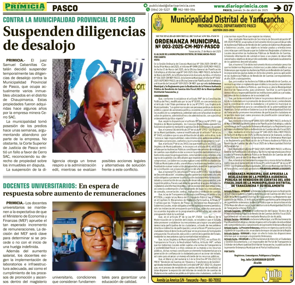 ORDENANZA MUNICIPAL ORDENANZA MUNICIPAL – JUEVES 24/ABR/2025 24 de abril de 2025 MUNICIPALIDAD DISTRITAL DE YANACANCHAORDENANZA MUNICIPAL N°003-2025-CM-MDY-PASCOPost navigationAnterior PETITORIO MINERO PASCO – JUEVES 24/ABR/2025Próximo APAFAS DEL VALLE DEL MANTARO: ANALIZARÁN AGUDA CRISIS DE LA EDUCACIÓN PERUANA