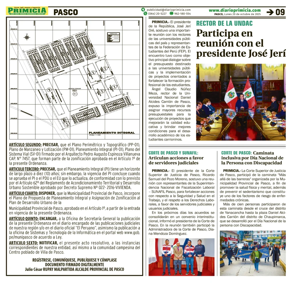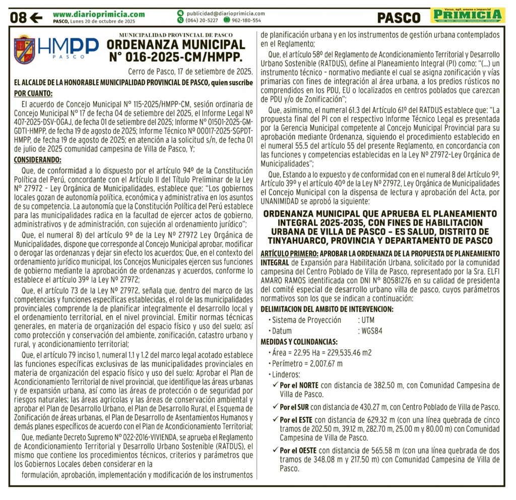 ORDENANZA MUNICIPAL PASCO ORDENANZA MUNICIPAL – LUNES 20/OCT/2025 1 min read 20 de octubre de 2025 MUNICIPALIDAD PROVINCIAL DE PASCOORDENANZA MUNICIPAL Nro. 016-2025-CM/HMPPContinue ReadingPrevious PETITORIO MINERO PASCO – LUNES 20/OCT/2025Next PRESENTARÁN XXXIX EDICIÓN: MARATÓN INTERNACIONAL DE LOS ANDES “FLORINDA CAMAYO LAPA”