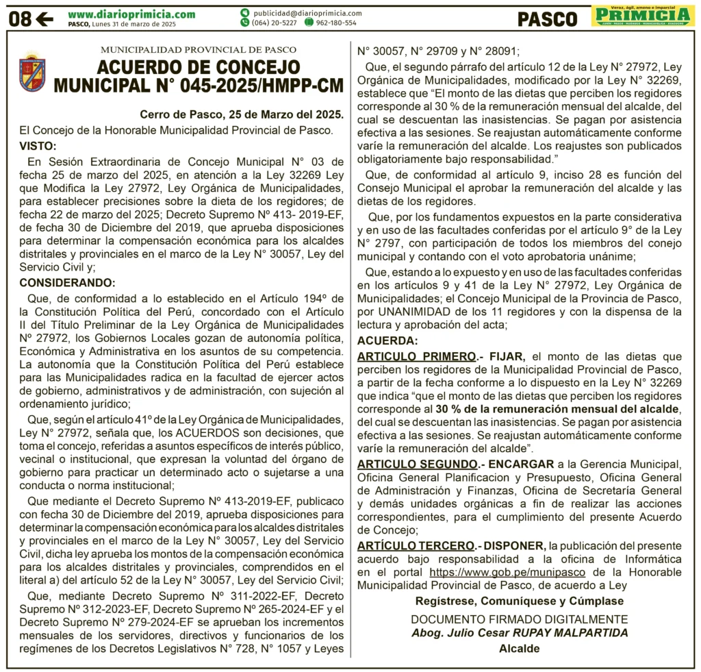 ORDENANZA MUNICIPAL ORDENANZA MUNICIPAL – LUNES 31/MAR/2025 1 min read 31 de marzo de 2025 MUNICIPALIDAD PROVINCIAL DE PASCOACUERDO DE CONCEJO MUNICIPAL N° 045-2025/HMPP-CMContinue ReadingPrevious COMUNICADO – LUNES 31/MAR/2025Next PETITORIO MINERO PASCO – LUNES 31/MAR/2025