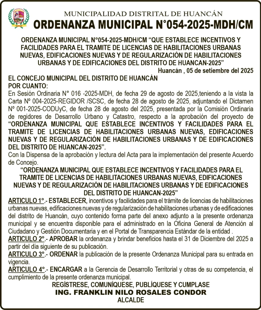 JUNIN ORDENANZA MUNICIPAL ORDENANZA MUNICIPAL – MARTES 09/SET/2025 1 min read 9 de septiembre de 2025 MUNICIPALIDAD DISTRITAL DE HUANCÁNORDENANZA MUNICIPAL N° 054-2025-MDH/CMContinue ReadingPrevious VENTA DE INMUEBLES – MARTES 09/SET/2025Next TRAS GANAR DE VISITA: FLAMENGO FBC AVANZA POR LA LIGA FEMENINA