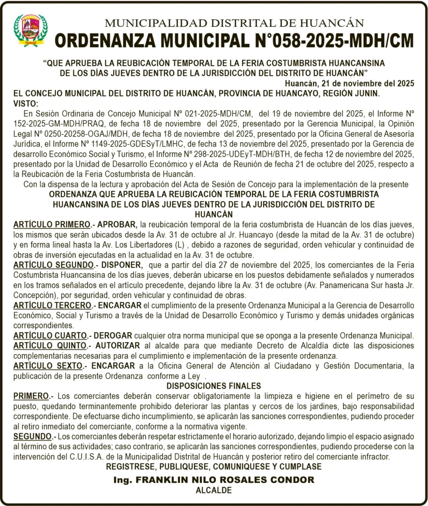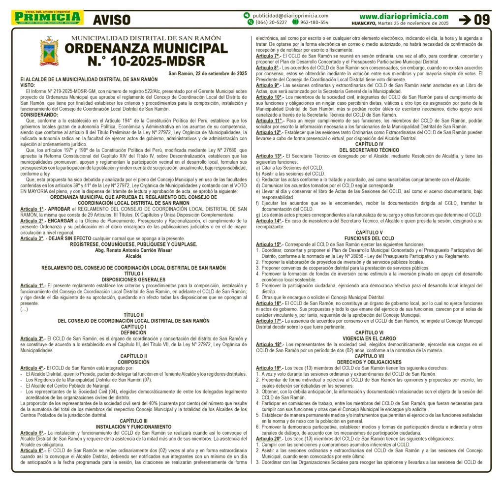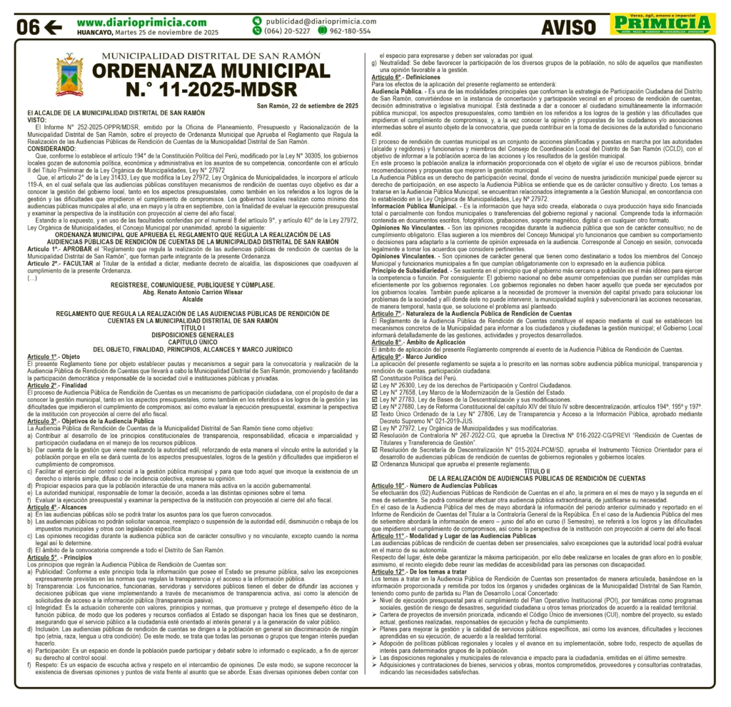 JUNIN ORDENANZA MUNICIPAL ORDENANZA MUNICIPAL – MARTES 25/NOV/2025 25 de noviembre de 2025 MUNICIPALIDAD DISTRITAL DE HUANCÁNORDENANZA MUNICIPAL N° 058-2025-MDH/CMMUNICIPALIDAD DISTRITAL DE SAN RAMÓNORDENANZA MUNICIPAL N° 10-2025-MDSRMUNICIPALIDAD DISTRITAL DE SAN RAMÓNORDENANZA MUNICIPAL N° 11-2025-MDSRPost navigationAnterior HUANDO: CHOCAN VEHÍCULOS EN VÍA HUANCAVELICA-HUANCAYOPróximo EDICTO MATRIMONIAL – MARTES 25/NOV/2025