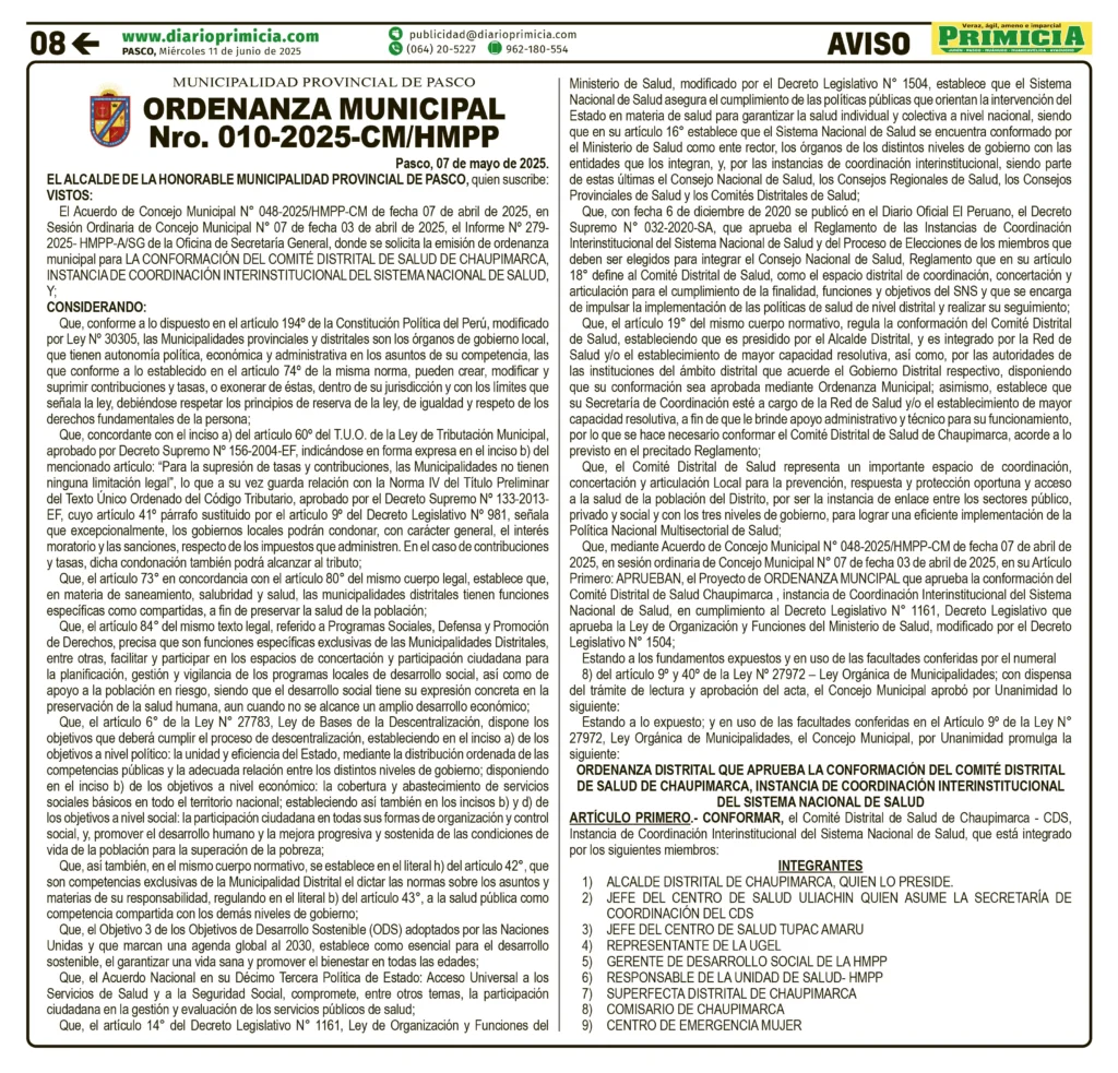 ORDENANZA MUNICIPAL ORDENANZA MUNICIPAL – MIÉRCOLES 11/JUN/2025 11 de junio de 2025 MUNICIPALIDAD PROVINCIAL DE PASCOORDENANZA MUNICIPAL Nro. 010-2025-CM/HMPPPost navigationAnterior CONVOCATORIAS – MIÉRCOLES 11/JUN/2025Próximo RESOLUCIÓN DE ALCALDÍA – MIÉRCOLES 11/JUN/2025