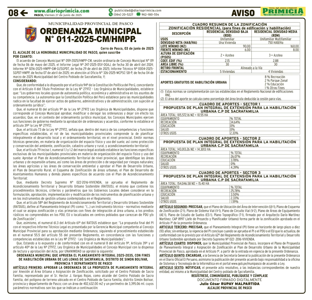 ORDENANZA MUNICIPAL ORDENANZA MUNICIPAL – VIERNES 27/JUN/2025 viernes, 27 de junio de 2025 | 1:02 AM MUNICIPALIDAD PROVINCIAL DE PASCOORDENANZA MUNICIPAL Nro. 011-2025-CM/HMPPNavegación de entradasAnterior PNP Y SERENAZGO: TRASLADAN A OCTOGENARIA QUE LUCHABA POR SU VIDASiguiente PETITORIO MINERO HUANCAVELICA – VIERNES 27/JUN/2025