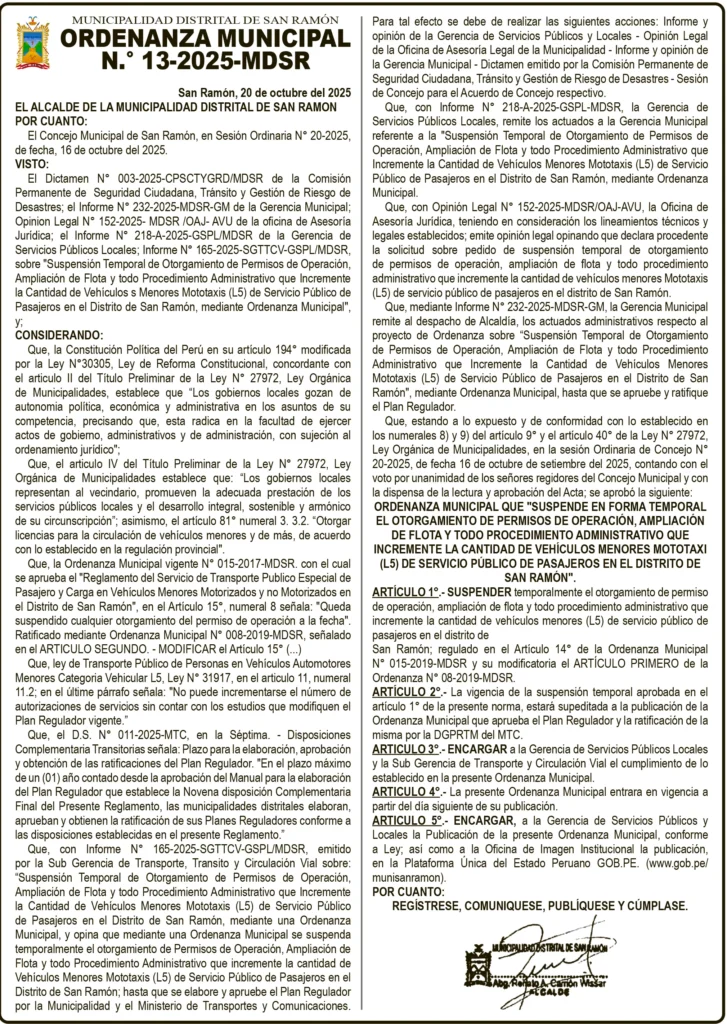 JUNIN ORDENANZA MUNICIPAL ORDENANZA MUNICIPAL – VIERNES 28/NOV/2025 28 de noviembre de 2025 MUNICIPALIDAD DISTRITAL DE SAN RAMÓNORDENANZA MUNICIPAL N° 13-2025-MDSRPost navigationAnterior VENTA DE VEHÍCULO – VIERNES 28/NOV/2025Próximo LLEGÓ EL FINAL: HERNÁN BARCOS LE DICE ADIÓ AL EQUIPO DE ALIANZA LIMA