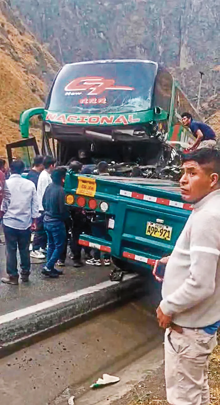 PRIMICIA.- El violento choque frontal se registró entre el bus de la empresa Nacional y tráiler en el sector de...