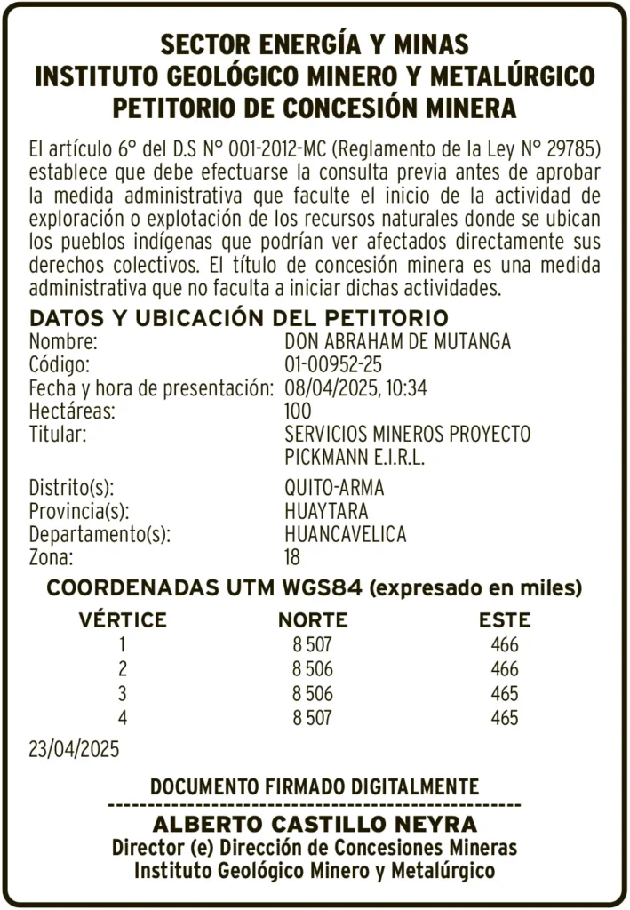 PETITORIOS MINEROS - HUANCAVELICA PETITORIO MINERO HUANCAVELICA – JUEVES 22/MAY/2025 22 de mayo de 2025 DATOS Y UBICACION DEL PETITORIONombre: DON ABRAHAM DE MUTANGACódigo: 01-00952-25Post navigationAnterior ¡INCREIBLE!: EE.UU. EMITE ALERTA DE VIAJE HACIA PERÚPróximo EDICTO MATRIMONIAL – JUEVES 22/05/2025