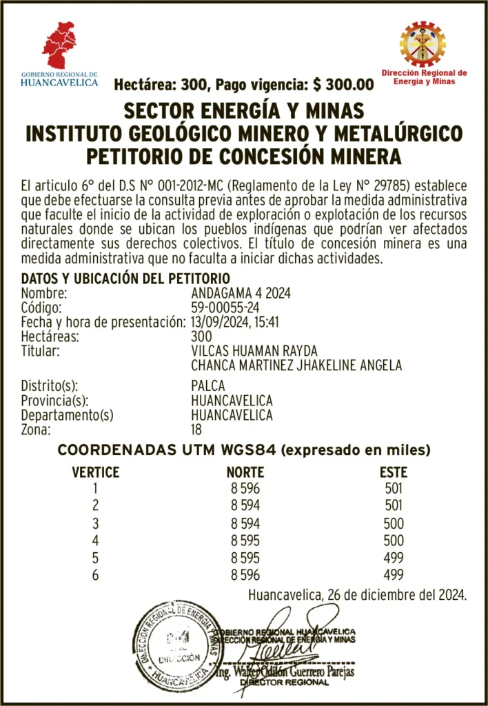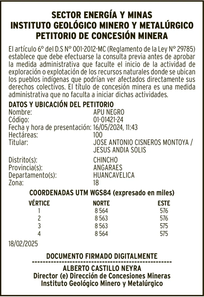 PETITORIOS MINEROS - HUANCAVELICA PETITORIO MINERO HUANCAVELICA – JUEVES 27/MAR/2025 27 de marzo de 2025 DATOS Y UBICACION DEL PETITORIONombre: ANDAGAMA 4 2024Código: 59-00055-24DATOS Y UBICACION DEL PETITORIONombre: APU NEGROCódigo: 01-01421-24Post navigationAnterior LLUVIAS E INUNDACIONES: AFECTAN ASILO DE ANCIANOS «SANTA TERESA DE JORNET» EN HUANCAVELICAPróximo PETITORIO MINERO PASCO – JUEVES 27/MAR/2025