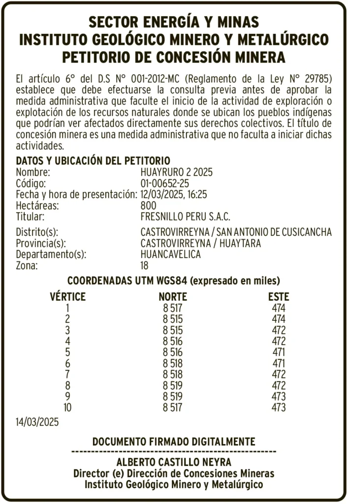 PETITORIOS MINEROS - HUANCAVELICA PETITORIO MINERO HUANCAVELICA – LUNES 05/MAY/2025 5 de mayo de 2025 DATOS Y UBICACION DEL PETITORIONombre: HUAYRURO 2 2025Código: 01-00652-25Post navigationAnterior ¡TERROR EN SACCRACANCHA!: ANCIANA DE 89 AÑOS ES SALVAJEMENTE ATACADA POR DOS PERROSPróximo PETITORIO MINERO PASCO – LUNES 05/MAY/2025