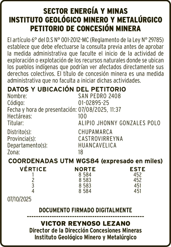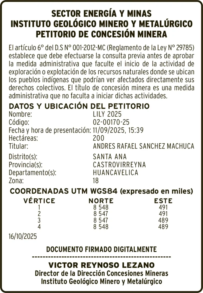 PETITORIOS MINEROS - HUANCAVELICA PETITORIO MINERO HUANCAVELICA – LUNES 10/NOV/2025 1 min read 10 de noviembre de 2025 DATOS Y UBICACION DEL PETITORIONombre: LILY 2025Código: 02-00170-25DATOS Y UBICACION DEL PETITORIONombre: SAN PEDRO 2408Código: 01-02895-25Continue ReadingPrevious EDICTO MATRIMONIAL – LUNES 10/NOV/2025Next RECTIFICACIÓN DE PARTIDA – LUNES 10/NOV/2025