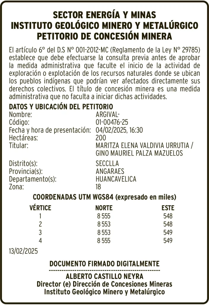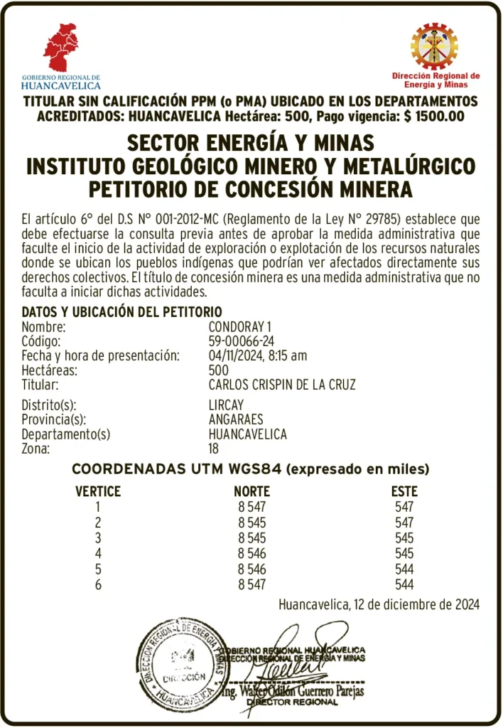 PETITORIOS MINEROS - HUANCAVELICA PETITORIO MINERO HUANCAVELICA – LUNES 14/ABR/2025 14 de abril de 2025 DATOS Y UBICACION DEL PETITORIONombre: ARGIVAL-Código: 01-00476-25DATOS Y UBICACION DEL PETITORIONombre: CONDORAY 1Código: 59-00066-24Post navigationAnterior SUDAMERICANO ATLÉTICO AL MUNDIAL DE TOKIOPróximo HUÁNUCO SEDE DE PRÓXIMOS JUEGOS DEPORTIVOS ESCOLARES