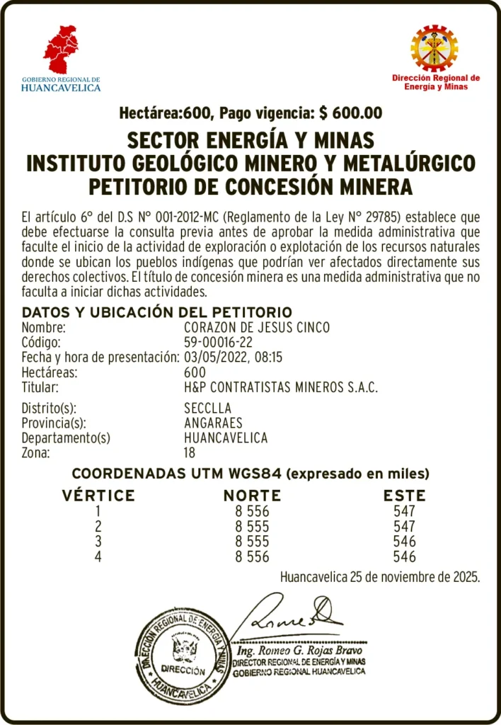 PETITORIOS MINEROS - HUANCAVELICA PETITORIO MINERO HUANCAVELICA – LUNES 26/ENE/2026 lunes, 26 de enero de 2026 | 6:43 AM DATOS Y UBICACION DEL PETITORIONombre: CORAZON DE JESUS CINCOCódigo: 59-00016-22Post navigationAnterior ADJUDICACIONES – LUNES 26/ENE/2026Próximo PETITORIO MINERO PASCO – LUNES 26/ENE/2026