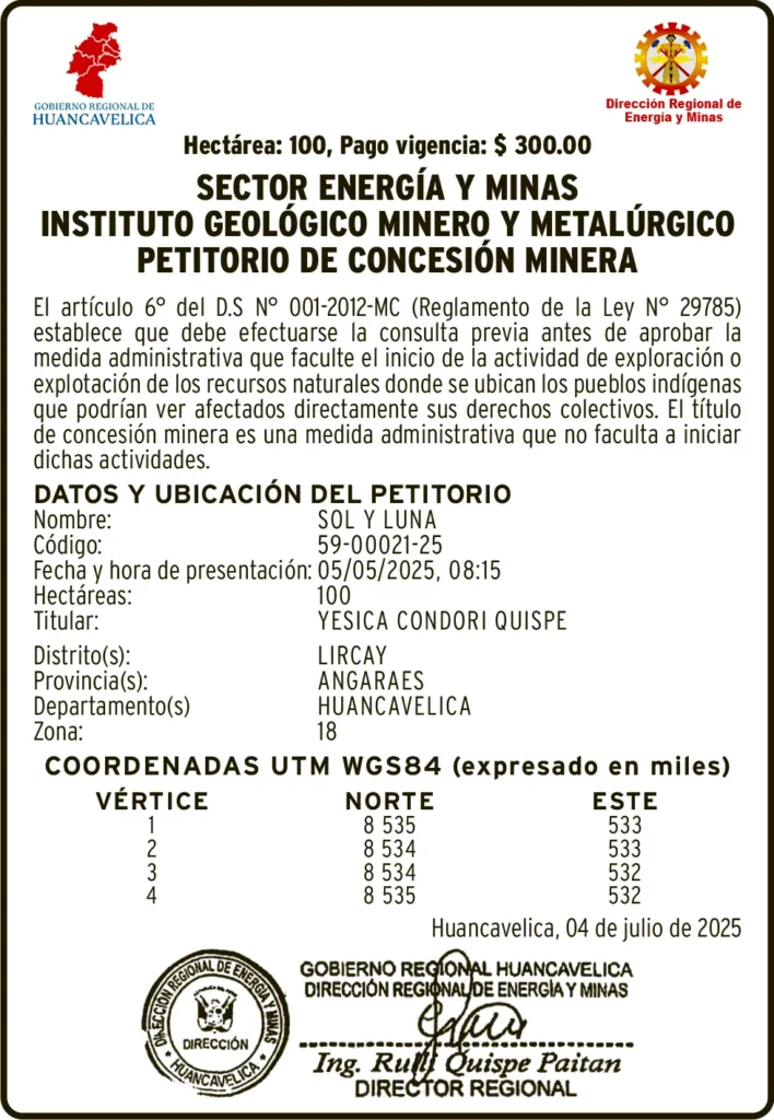 PETITORIOS MINEROS - HUANCAVELICA PETITORIO MINERO HUANCAVELICA – MARTES 04/NOV/2025 1 min read 4 de noviembre de 2025 DATOS Y UBICACION DEL PETITORIONombre: SOL Y LUNACódigo: 59-00021-25Continue ReadingPrevious COMUNICADO – MARTES 04/NOV/2025Next CUATRO EQUIPOS POR EL TÍTULO DE LA COPA PERÚ