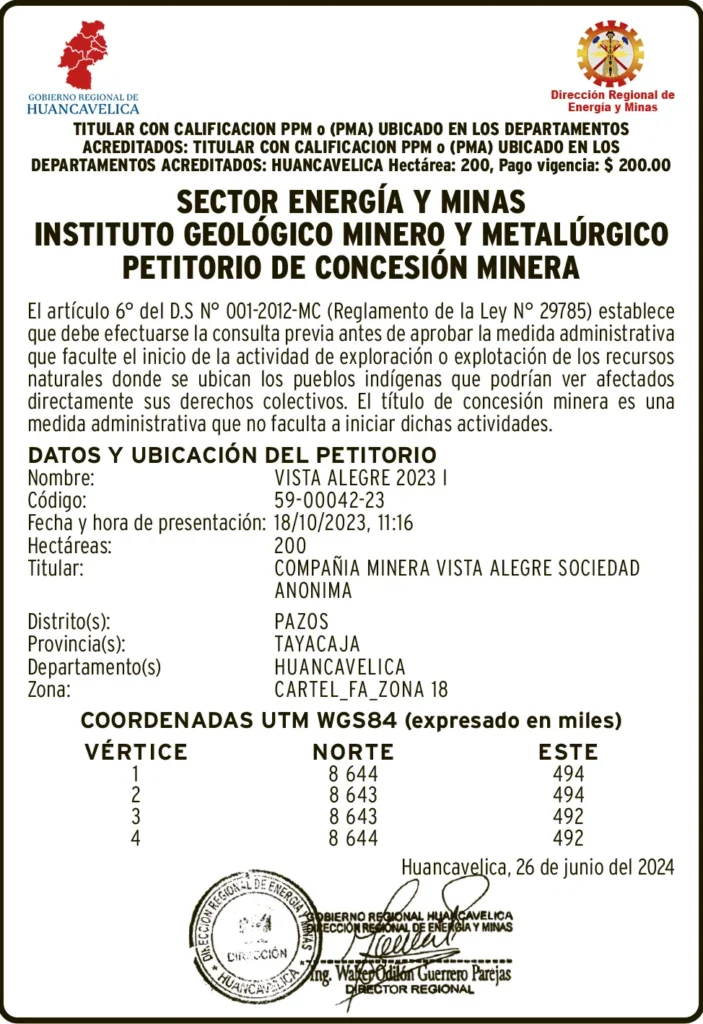 PETITORIOS MINEROS - HUANCAVELICA PETITORIO MINERO HUANCAVELICA – MARTES 07/OCT/2025 7 de octubre de 2025 DATOS Y UBICACION DEL PETITORIONombre: LURDES KAZAMACódigo: 59-00034-25DATOS Y UBICACION DEL PETITORIONombre: VISTA ALEGRE 2023 ICódigo: 59-00042-23Post navigationAnterior PETITORIO MINERO PASCO – MARTES 07/OCT/2025Próximo CONVOCATORIAS – MARTES 07/OCT/2025