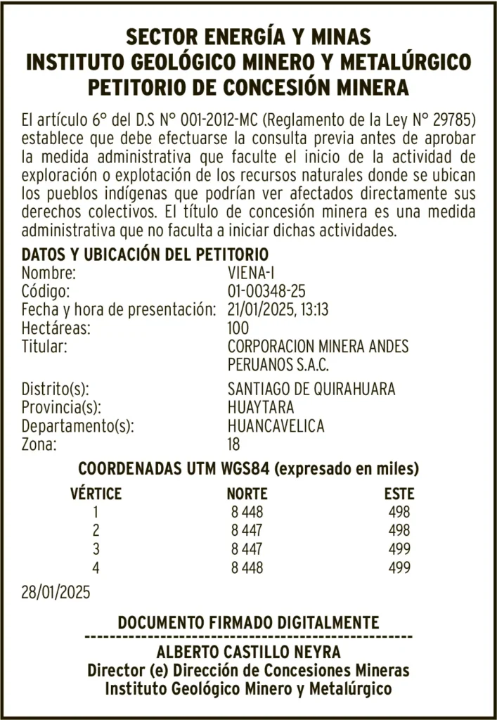 PETITORIOS MINEROS - HUANCAVELICA PETITORIO MINERO HUANCAVELICA – MARTES 11/MAR/2025 11 de marzo de 2025 DATOS Y UBICACION DEL PETITORIONombre: VIENA-ICódigo: 01-00348-25Post navigationAnterior NOTIFICACIÓN DE PRETENSIÓN – MARTES 11/MAR/2025Próximo PETITORIO MINERO PASCO – MARTES 11/MAR/2025
