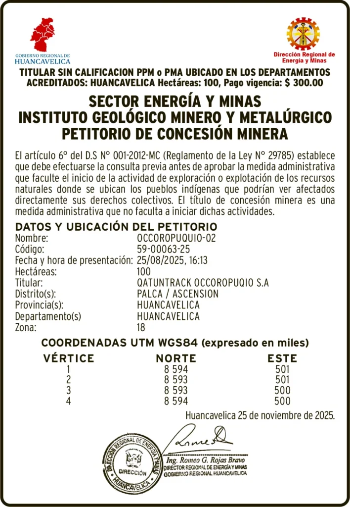 PETITORIOS MINEROS - HUANCAVELICA PETITORIO MINERO HUANCAVELICA – MARTES 16/DIC/2025 16 de diciembre de 2025 DATOS Y UBICACION DEL PETITORIONombre: OCCOROPUQUIO-02Código: 59-00063-25Post navigationAnterior TAYACAJA: AGRICULTOR ES HALLADO SIN VIDA POR EL RÍO MANTAROPróximo EDICTO JUDICIAL PASCO – MARTES 16/DIC/2025