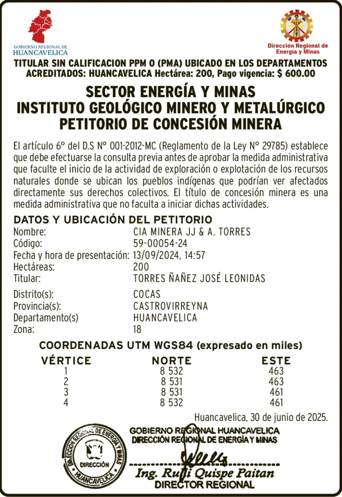 PETITORIOS MINEROS - HUANCAVELICA PETITORIO MINERO HUANCAVELICA – MARTES 28/OCT/2025 1 min read 28 de octubre de 2025 DATOS Y UBICACION DEL PETITORIONombre: CIA MINERA JJ & A. TORRESCódigo: 59-00054-24Continue ReadingPrevious ACOSTAMBO: DESARTICULAN BANDA CRIMINAL “LOS VIAJEROS DEL NORTE” EN OPERATIVO RELÁMPAGONext NOTIFICACIÓN DE PRETENSIÓN – MARTES 28/OCT/2025