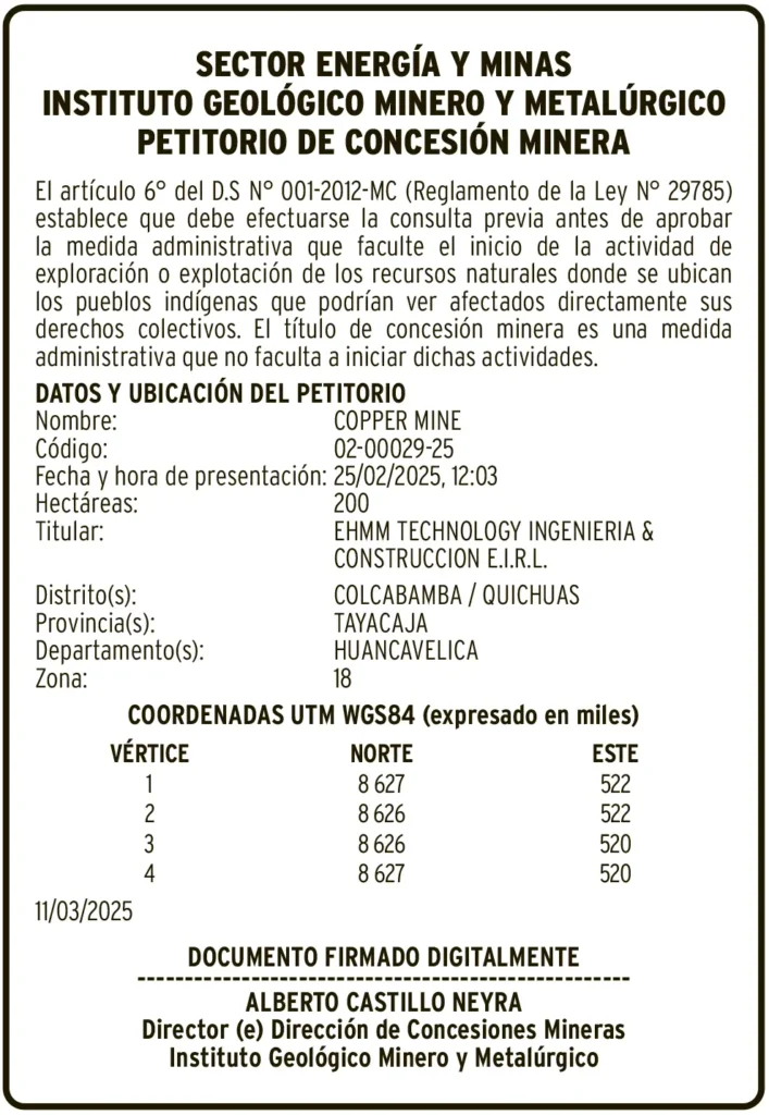 PETITORIOS MINEROS - HUANCAVELICA PETITORIO MINERO HUANCAVELICA – MARTES 29/ABR/2025 29 de abril de 2025 DATOS Y UBICACION DEL PETITORIONombre: COPPER MINECódigo: 02-00029-25Post navigationAnterior CONVOCATORIAS – MARTES 29/ABR/2025Próximo COMIENZA JUICIO ORAL: CONTRA ALCALDE Y FUNCIONARIOS DE PILCOMAYO