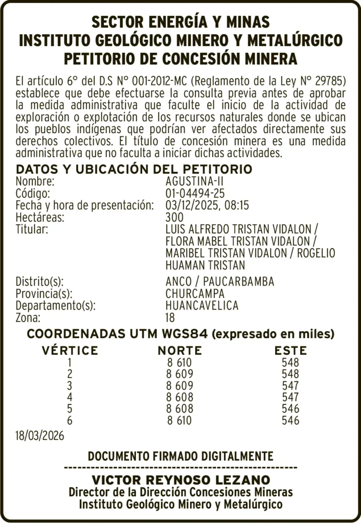 PETITORIOS MINEROS - HUANCAVELICA PETITORIO MINERO HUANCAVELICA – MARTES 31/MAR/2026 martes, 31 de marzo de 2026 | 6:19 AM DATOS Y UBICACION DEL PETITORIONombre: AGUSTINA-IICódigo: 01-04494-25Navegación de entradasAnterior DISOLUCIÓN / LIQUIDACIÓN / TRANSFORMACIÓN – MARTES 31/MAR/2026Siguiente NOTIFICACIÓN DE PRETENSIÓN – MARTES 31/MAR/2026