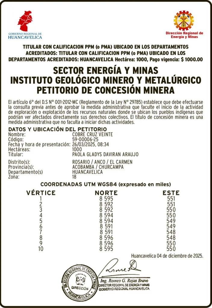 PETITORIOS MINEROS - HUANCAVELICA PETITORIO MINERO HUANCAVELICA – MIÉRCOLES 07/ENE/2026 miércoles, 7 de enero de 2026 | 1:56 AM DATOS Y UBICACION DEL PETITORIONombre: COBRE CRUZ VEINTECódigo: 59-00006-25Post navigationAnterior EDICTO MATRIMONIAL – MIÉRCOLES 07/ENE/2026Próximo ARRANCÓ PERIODO DE PASES LIBRES: CAMPEONATO DE LA COPA PERÚ 2026 SERÁ CON ALGUNOS CAMBIOS