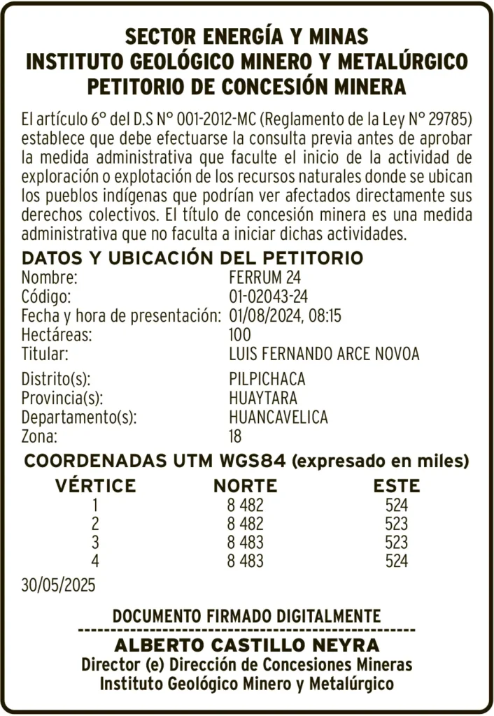 PETITORIOS MINEROS - HUANCAVELICA PETITORIO MINERO HUANCAVELICA – MIÉRCOLES 18/JUN/2025 18 de junio de 2025 DATOS Y UBICACION DEL PETITORIONombre: FERRUM 24Código: 01-02043-24Post navigationAnterior EDICTO JUDICIAL HUANCAVELICA – MIÉRCOLES 18/JUN/2025Próximo EDICTO MATRIMONIAL – MIÉRCOLES 18/06/2025